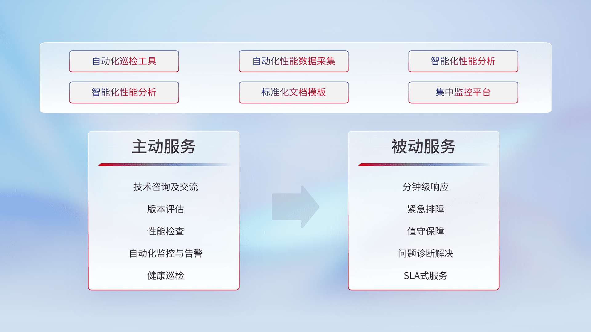智能化工具和标准化文档,,,,保障服务质量,,提供主动服务(包含技术咨询、、、、版本评估、、、性能检查、、、自动化监控与告警、、健康巡检)和被动服务包含(分钟级响应、、、紧急排障、、、、值守保障、、问题诊断解决、、、、SLA服务)。。